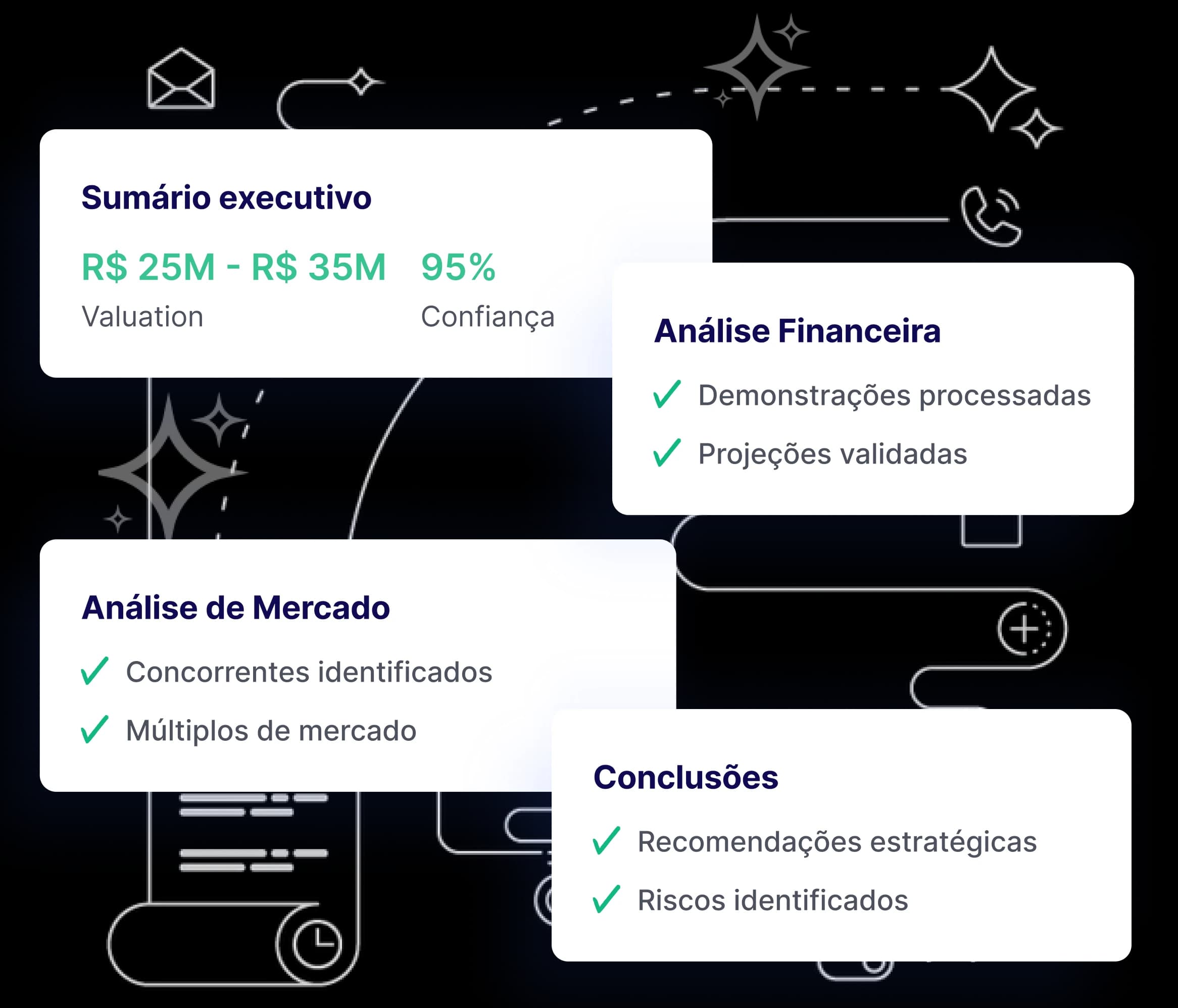 Desde a due diligence de M&A até o planejamento estratégico, nossa plataforma se adapta às suas necessidades específicas de avaliação.